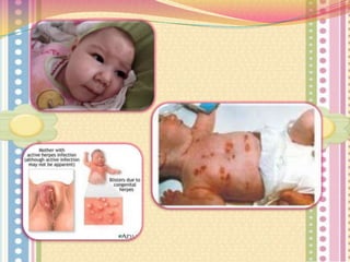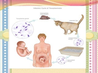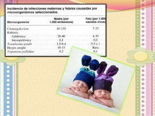 El documento describe las infecciones congénitas agrupadas bajo el acrónimo TORCH. Estas infecciones pueden causar daño severo de por vida en el feto y se caracterizan por presentar signos y síntomas crónicos como anomalías del SNC, oculares y cardíacas. La transmisión puede ocurrir por vía hematógena, durante el canal de parto o de forma ascendente.