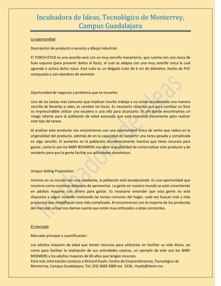 El documento describe una idea de negocio para un producto llamado TORCH-STICK, un palo con un mecanismo simple para cambiar focos. El producto resolvería el problema de cambiar focos de forma segura y fácil para adultos mayores. El mercado objetivo serían 8 millones de adultos mayores en México que podrían usar el producto para facilitar tareas domésticas. El modelo de negocio implicaría fabricar el producto, venderlo a través de tiendas Walmart en México, y generar ingresos a un precio estimado de $250 pes