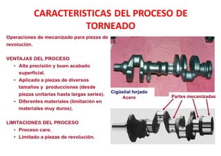 El documento describe el proceso de torneado y sus características. El torneado es un proceso de maquinado en el que una herramienta remueve material de una pieza cilíndrica en rotación. Se realiza en una máquina llamada torno. Existen diferentes tipos de tornos como los paralelos, verticales y revolver. El documento también explica conceptos como las partes de un torno, sujeción de piezas, operaciones de torneado y parametros de corte.