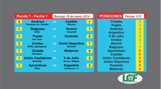 El documento presenta los resultados de 13 fechas de la Liga Casildense de Fútbol. En cada fecha se enumeran los partidos jugados y sus resultados, así como la tabla de posiciones acumulada. América finalizó en la primera posición con 29 puntos, seguido por Casilda con 25 puntos y Alumni con 24 puntos.