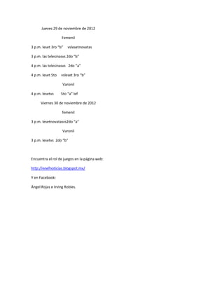 Este documento presenta el calendario de partidos de fútbol para varios equipos femeniles y varoniles durante las semanas del 20 de noviembre al 30 de noviembre de 2012. El calendario detalla la fecha, hora y oponentes de cada partido. También incluye información sobre dónde encontrar el rol de juegos en una página web y en Facebook.