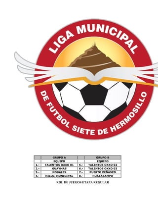 Este documento presenta el calendario y rol de juegos para el Torneo Estatal Navideño Categoría 2001-2002. Los equipos participantes están divididos en dos grupos, A y B. Se jugarán tres fechas de partidos durante el fin de semana para determinar al ganador y segundo lugar de cada grupo, quienes disputarán las finales de grupo el domingo en la tarde.