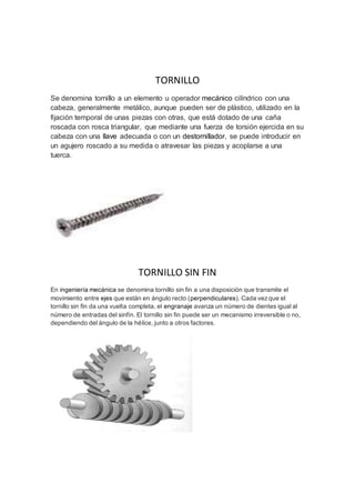 Un tornillo es un elemento cilíndrico con cabeza y caña roscada que se usa para fijar piezas temporalmente. Se introduce en un agujero roscado o a través de piezas usando fuerza de torsión en su cabeza. Un tornillo sin fin transmite movimiento entre ejes perpendiculares, haciendo que el engranaje avance un número de dientes igual al número de entradas cada vuelta completa del tornillo. Puede ser reversible o no dependiendo del ángulo de la hélice.