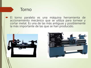 El documento describe el funcionamiento y las partes del torno paralelo, incluyendo su estructura como la bancada, cabezales y carros, y las operaciones de trabajo como refrentado y taladrado. También se abordan aspectos técnicos como la formación de viruta, el uso de lubricantes y la importancia de la seguridad en el manejo del torno. Se enfatiza la necesidad de mantenimiento y la revisión regular para garantizar un funcionamiento adecuado y la calidad de los mecanizados.