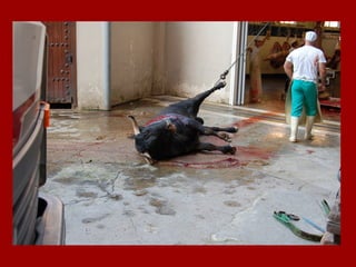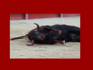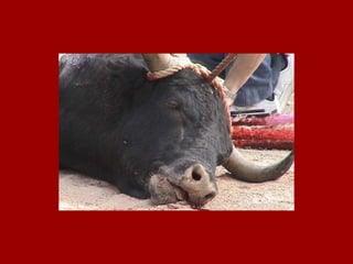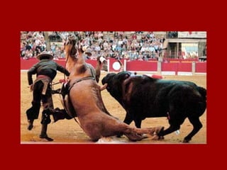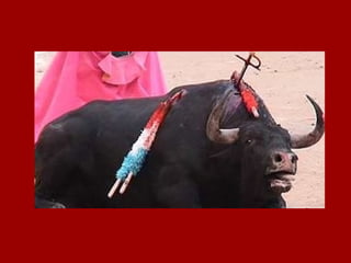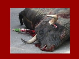 El documento describe la tortura que sufren los toros en las corridas de toros, incluyendo cómo son debilitados antes de entrar a la plaza, el uso de picas y banderillas para desangrarlos, y finalmente la muerte lenta del toro luego de ser apuñalado con espadas. Se argumenta que las corridas de toros son una tradición cruel que denigra a la humanidad y que la gente debería rechazar este tipo de eventos y enseñar a los niños a respetar a todos los seres vivos.