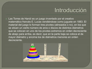 Las Torres de Hanói es un juego inventado en 1883 que consiste en mover discos de diferentes tamaños entre tres postes siguiendo las reglas de que solo se puede mover un disco a la vez y no se pueden colocar discos grandes sobre discos pequeños. El objetivo es mover todos los discos de un poste inicial a un poste final en el menor número de movimientos posible. Este juego ilustra conceptos de programación recursiva ya que para resolver el problema completo se debe dividir en subproblemas más pequeños.