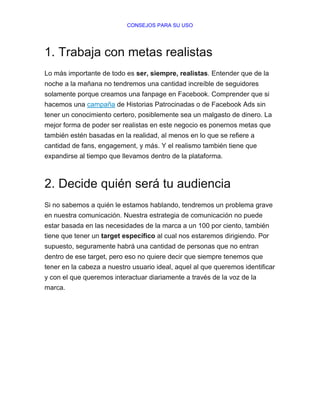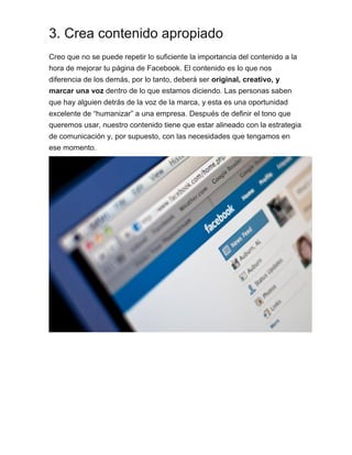 El documento proporciona consejos para mejorar el uso de una página de Facebook. En primer lugar, recomienda establecer metas realistas y no esperar resultados increíbles de la noche a la mañana. En segundo lugar, sugiere decidir quién será la audiencia objetivo. Por último, aconseja crear contenido original y apropiado para la estrategia y necesidades de comunicación.
