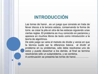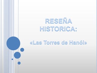 Las Torres de Hanoi es un juego matemático que implica mover discos de una varilla a otra siguiendo reglas específicas. Inventado por Édouard Lucas en 1883, el objetivo es trasladar todos los discos a otra estaca sin colocar un disco más grande sobre uno más pequeño. Este problema se utiliza frecuentemente en la enseñanza de la recursividad y la teoría de algoritmos, mostrando que la complejidad crece exponencialmente con el número de discos.