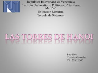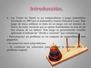 La Torre de Hanoi es un rompecabezas matemático inventado por Édouard Lucas en 1883, que consiste en mover discos entre tres estacas siguiendo reglas específicas. Este juego ilustra el concepto de recursión y se resuelve mediante un algoritmo que divide el problema en subproblemas más sencillos. La leyenda asociada sugiere que el movimiento de los discos es parte de un esfuerzo cósmico con implicaciones filosóficas sobre el mundo.