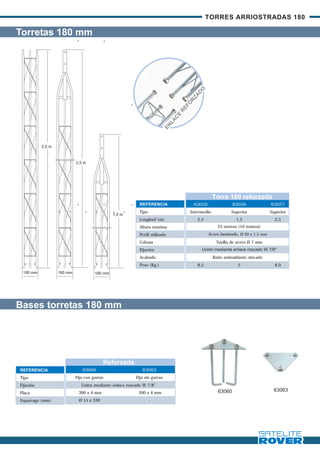 Las instrucciones describen el montaje de torres arriostradas de 180 mm. Se componen de tramos intermedios y superiores unidos mediante enlaces roscados. Requieren una cimentación de hormigón armado con cuatro zapatas y cables de acero arriostrados cada 120° para soportar cargas de viento. El montaje se realiza de forma segura tramo a tramo o con grúa. Se recomienda inspeccionar anualmente las uniones y tensión de los cables.