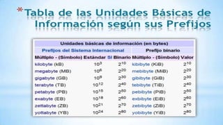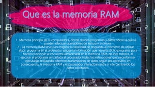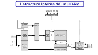 El documento describe diferentes tipos de memoria en una computadora. Explica la memoria RAM, que almacena temporalmente datos y programas para su uso rápido por el procesador. También describe la memoria ROM, que almacena datos de forma permanente, incluyendo PROM, EPROM y EEPROM. Luego explica la estructura y funcionamiento de la memoria DRAM y SRAM.
