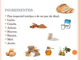 Este documento proporciona una receta para hacer torrijas caseras. Los ingredientes necesarios incluyen pan, leche, canela, azúcar, huevos, harina, miel y aceite. El proceso implica empapar rebanadas de pan en una mezcla de leche, azúcar y canela, rebozarlas con harina y huevo y freírlas. Luego se vierte sobre las torrijas una salsa hecha con leche, canela y miel para que se empapen más.