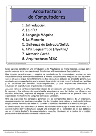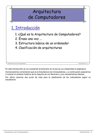 Este documento presenta una introducción a la arquitectura de computadores. Comienza definiendo la arquitectura de computadores y diferenciándola de la estructura y tecnología. Luego describe brevemente las primeras generaciones de computadores, destacando el desarrollo de la máquina de von Neumann. Explica los componentes básicos de esta máquina y su influencia en las arquitecturas actuales. Por último, introduce dos formas de clasificar las arquitecturas según la taxonomía de Flynn.
