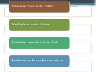 Este documento describe la torsión tibial, una condición en la que la tibia gira internamente o externamente. La torsión tibial interna causa que los pies apunten hacia adentro, mientras que la torsión tibial externa causa que los pies apunten hacia afuera. Generalmente se corrige espontáneamente a medida que el niño crece, pero en casos graves puede requerir tratamiento como una férula o cirugía. El documento también discute los factores como la edad, gravedad y antecedentes familiares que