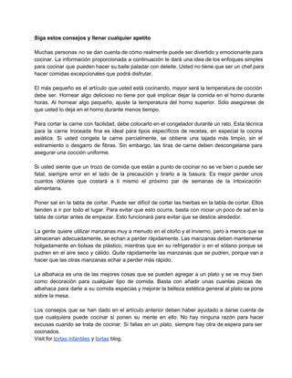 El documento ofrece consejos prácticos para hacer la cocina más accesible y divertida, sugiriendo técnicas como ajustar la temperatura del horno según el tamaño de la comida y congelar carne para un corte más fácil. También menciona la importancia de desechar alimentos en mal estado para evitar intoxicaciones y proporciona recomendaciones sobre el almacenamiento adecuado de manzanas. Finalmente, se enfatiza que cualquiera puede cocinar si se lo propone, sin necesidad de ser un chef profesional.
