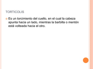 La tortícolis es una condición en la que el cuello se tuerce y la cabeza apunta hacia un lado mientras la barbilla apunta hacia el otro. Puede ser hereditaria, adquirida por daño a los músculos o nervios del cuello, o idiopática sin causa conocida. Los síntomas incluyen limitación de movimiento del cuello y dolor. El tratamiento depende de la causa y puede incluir estiramientos, masajes, medicamentos o cirugía.