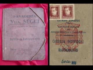 Durante la dictadura franquista en España, hubo escasez de alimentos debido a la guerra, la política económica y el aislamiento. El gobierno implementó un sistema de racionamiento mediante cartillas que asignaban cantidades semanales limitadas de productos básicos como aceite, azúcar y pan a cada persona. Las cartillas clasificaban a las personas en categorías según su situación social y laboral. Aunque las raciones eran insuficientes, el sistema fomentó la creatividad culinaria para preparar platos con ingredientes alternativos.