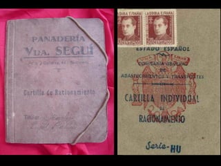 Durante la dictadura de Franco en España en los años 40, hubo escasez de alimentos debido a la guerra, la política económica y el aislamiento. El gobierno implementó un sistema de racionamiento mediante cartillas que asignaban cantidades semanales limitadas de productos básicos como azúcar, arroz y aceite a cada persona. Las personas debían comprar en el mercado negro si querían obtener más alimentos o productos no controlados, con precios más altos y riesgos legales. La gente tuvo que ser ingeniosa para complementar sus rac
