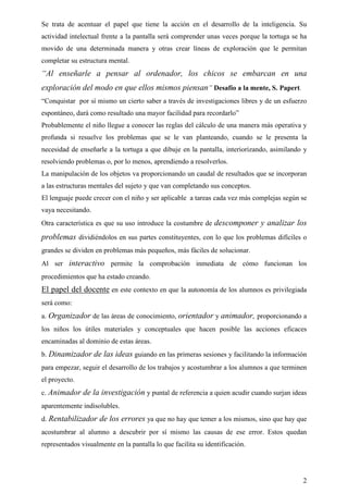 El documento describe el lenguaje de programación Logo y su uso para enseñar geometría a través de la "tortuga". Logo fue creado por Seymour Papert en 1968 y usa comandos simples para mover una tortuga virtual y dibujar figuras geométricas. El documento explica cómo los estudiantes pueden usar Logo para explorar conceptos como ángulos, líneas, polígonos y más, aprendiendo a resolver problemas geométricos de manera interactiva. También proporciona ejemplos de actividades con y sin computadoras para