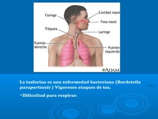 La tosferina es una enfermedad bacteriana que causa fuertes ataques de tos y dificultad para respirar, pudiendo causar discapacidad o muerte. Se transmite principalmente por contacto directo o por partículas expulsadas al toser, y es más común en niños menores de 5 años. La vacunación es fundamental para prevenirla.