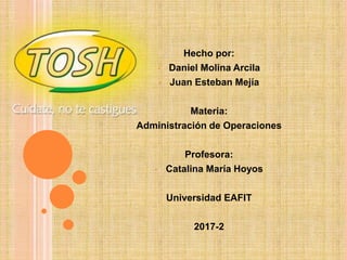 Este documento presenta información sobre Tosh, una marca de galletas saludables creada por Noel en 1998 para satisfacer las necesidades de personas que buscaban alimentos balanceados. Explica la visión, misión e historia de Tosh, así como sus productos, estrategias de diferenciación y competencia. También menciona que Tosh se ha beneficiado al pertenecer a Noel por costos, distribución y mercadeo.