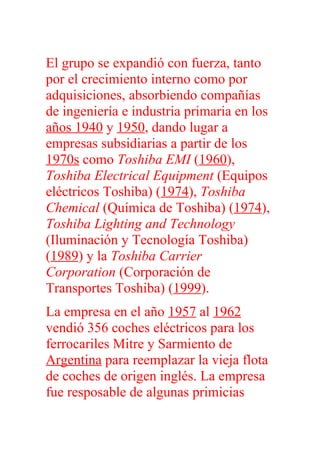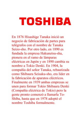 Toshiba se formó en 1939 a través de la fusión de dos empresas pioneras en la fabricación de equipos eléctricos y de telegrafía en Japón. A lo largo de los años, Toshiba se expandió a través de adquisiciones y el desarrollo de nuevas tecnologías como el radar, la TAC, el microondas y la computadora portátil. En la actualidad, Toshiba forma parte del keiretsu Mitsui y mantiene vínculos estrechos con otros miembros a través de acuerdos com