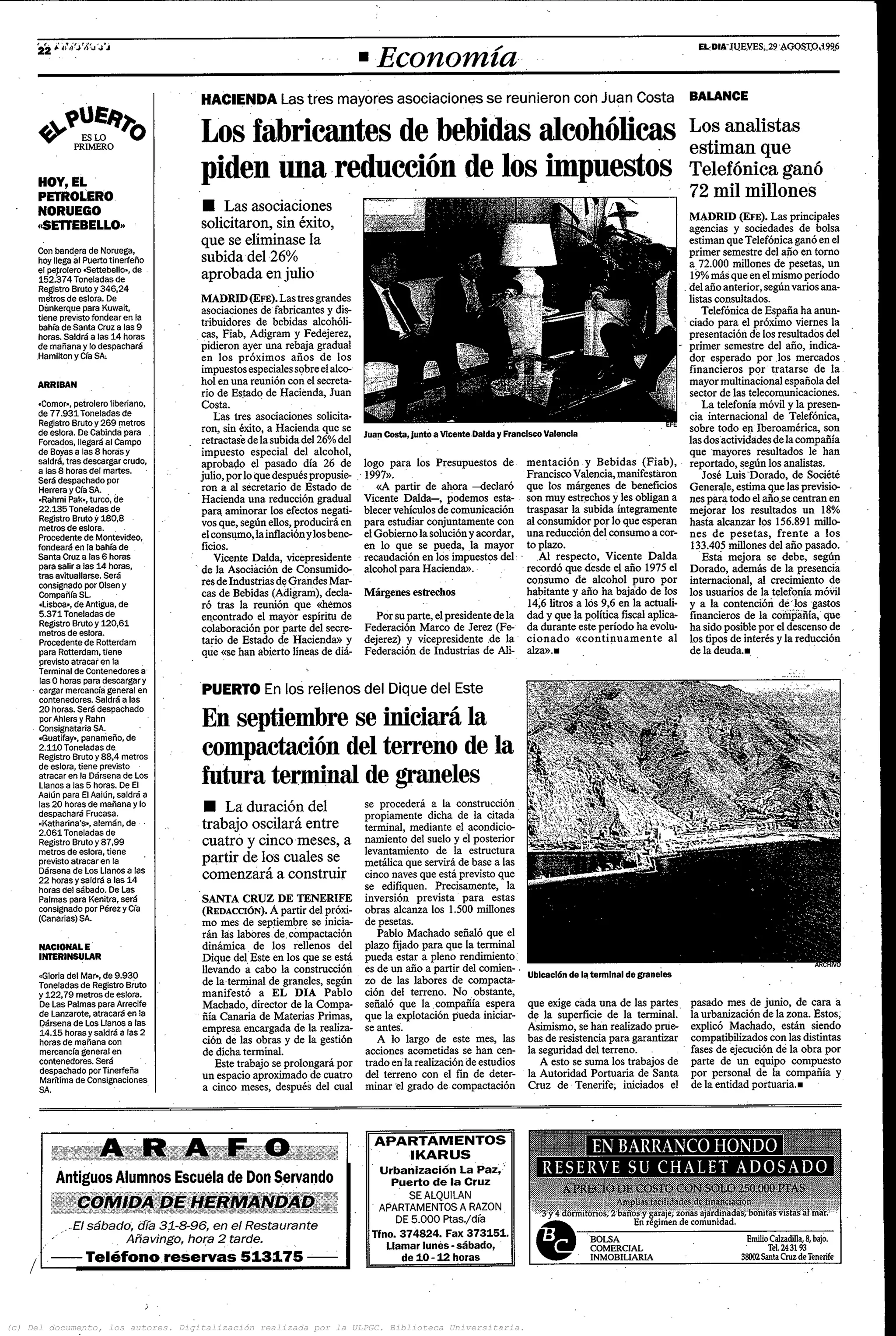 El documento resume las principales noticias económicas del día. Se estima que el ahorro nacional aumentará este año en 1,2 billones de pesetas, equivalente al 2,1% del PIB. También habla sobre la llegada de un crucero noruego al puerto de Santa Cruz y sobre la confirmación de la UE de que no suspenderá las ayudas del Fondo de Cohesión a España en 1996 aunque establecerá condiciones.