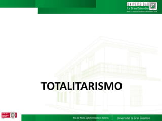 El totalitarismo consiste en regímenes políticos donde el Estado ejerce todo el poder sin restricciones. Exaltan a un líder con poder ilimtado y usan propaganda e intensos mecanismos de control. Se dio en Alemania e Italia bajo Hitler y Mussolini, en la Unión Soviética bajo Lenin y Stalin, y en Corea del Norte bajo la dinastía Kim.