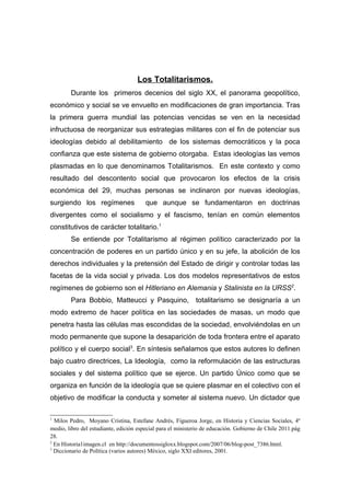 Este documento resume los regímenes totalitarios que surgieron en Europa en el siglo XX, incluyendo el fascismo italiano bajo Mussolini y el nazismo alemán bajo Hitler. Explica cómo estos regímenes se caracterizaron por concentrar todo el poder en un líder y un partido único, abolir los derechos individuales y controlar todos los aspectos de la vida social y política.