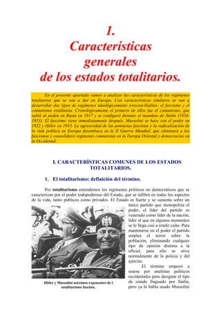 Este documento describe las características generales de los estados totalitarios que surgieron en Europa en el siglo XX, como el fascismo y el comunismo estalinista. Señala que estos regímenes compartían elementos como el control total del Estado sobre todos los aspectos de la vida pública y privada, el monopolio del poder por un único partido gobernante y su líder carismático, y la supresión de la democracia y las libertades individuales. Asimismo, analiza las características ideológicas específicas del fascismo, como su nacional
