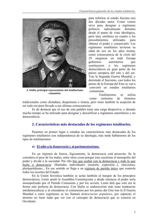 Este documento describe las características generales de los estados totalitarios. Explica que los regímenes totalitarios de la Unión Soviética y de los países fascistas como Alemania e Italia compartían características como el control absoluto del Estado sobre todos los aspectos de la vida pública y privada, el monopolio del poder por un único partido gobernante liderado por un líder carismático venerado casi como un dios, y la supresión de los derechos individuales en favor de los derechos del colectivo y del Estado.