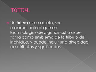 Este documento discute los conceptos de tótem y tabú. Explica que un tótem es un objeto o animal que representa a una tribu o individuo y puede tener diversos atributos y significados culturales. No es necesariamente un fenómeno religioso. Por otro lado, un tabú se refiere a una conducta o actividad moralmente prohibida por una sociedad, grupo o religión, generalmente sin justificación racional. Quien rompa un tabú es castigado.