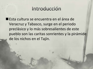 La cultura totonaca se desarrolló en el área de Veracruz y Tabasco durante el periodo preclásico. Es más conocida por sus famosas "caritas sonrientes" y la pirámide de los nichos en el sitio arqueológico de El Tajín.