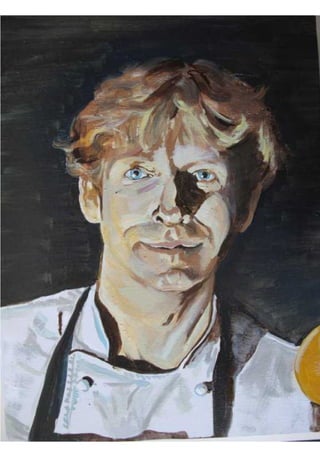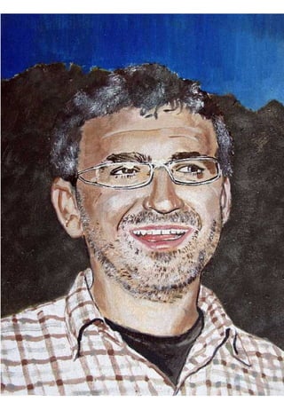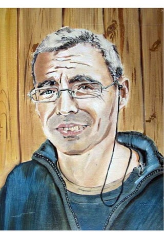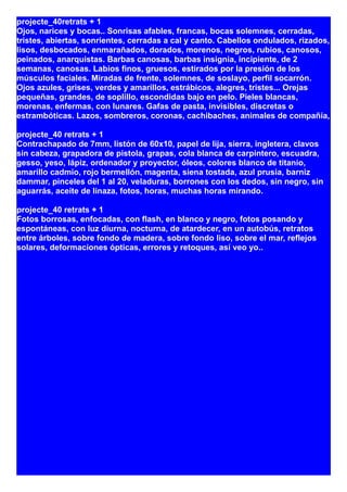 Este documento presenta una serie de 41 retratos de personas realizados por el artista. Describe brevemente algunos detalles físicos de cada persona como ojos, bocas, cabello, pieles y gafas. También incluye detalles sobre el proceso de creación de los retratos incluyendo el uso de fotos, óleos, pinceles y horas de observación de las personas. Finalmente lista los nombres de las 41 personas retratadas.