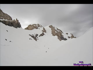 Este documento describe una ruta de senderismo que comienza en el Valle de Pineta y pasa por varios lugares notables como el Circo de Pineta, el Refugio Tucarroya desde donde se ve el Monte Perdido, los Picos de Astazou y el Refugio de Espuguettes, el Circo de Gavarnie y los Picos de la Cascada, llegando al Refugio y Brecha de Rolando en la frontera entre Francia y España, y regresando al punto de partida en el Valle de Pineta.
