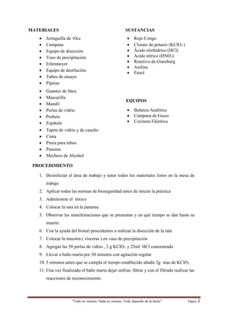 Este documento describe un experimento en el que se administró ácido nítrico a una rata por vía intraperitoneal. La rata mostró síntomas de dolor, vómito y hemorragia gástrica, y murió en 4 minutos. Se realizaron pruebas de reconocimiento que confirmaron la presencia de ácido nítrico. El documento concluye que el ácido nítrico es altamente tóxico y letal a una dosis de 10 ml, y que las pruebas de reconocimiento son necesarias para verificar una intoxicación por este comp