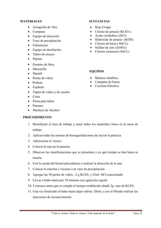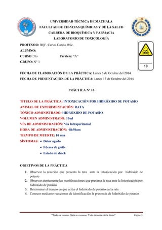 Este documento describe un experimento en el que se administró hidróxido de potasio a una rata por vía intraperitoneal. La rata murió en 10 minutos y presentó síntomas como dolor agudo y estado de shock. Se realizaron reacciones químicas con la muestra biológica para identificar la presencia de hidróxido de potasio, como la formación de precipitados blancos con cloruro de bario y sulfato de zinc. El documento concluye que el hidróxido de potasio es altamente tóxico y letal