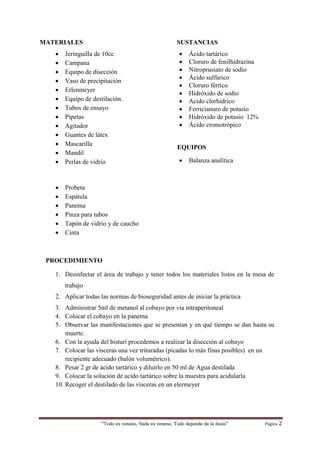 Este documento describe una práctica de laboratorio sobre la intoxicación por metanol en cobayos. Se administró metanol por vía intraperitoneal a un cobayo y se observaron sus síntomas y tiempo de muerte. Luego se realizaron reacciones de identificación en las vísceras del animal para confirmar la presencia de metanol. El documento concluye que el metanol es muy tóxico y las reacciones de identificación son indispensables para verificar una intoxicación por este compuesto.