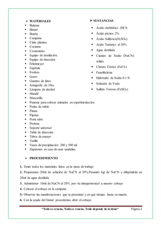 Este documento describe una práctica de laboratorio sobre intoxicación por cianuro en un cobayo. Se administra cianuro de sodio al 20% por vía intraperitoneal al cobayo y se observa su reacción hasta la muerte en pocos minutos. Luego se destilan las vísceras del animal para identificar la presencia de cianuro mediante reacciones como la formación de azul de Prusia. El documento concluye que el cianuro es extremadamente tóxico y puede causar la muerte rápidamente a una dosis letal baja.