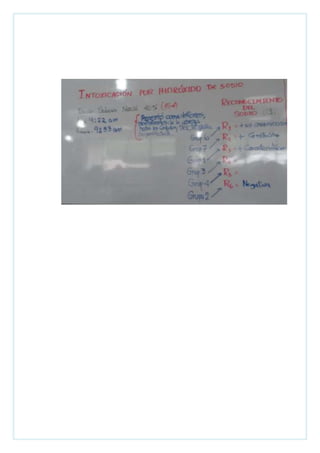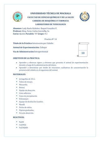 1) Los estudiantes realizaron una práctica de intoxicación por cadmio en un cobayo. 2) Administraron cadmio al cobayo vía parenteral y observaron los síntomas hasta su muerte en aproximadamente 1 minuto. 3) Luego diseccionaron al cobayo, extrajeron los órganos y realizaron destilación y reacciones químicas que confirmaron la presencia de cadmio.