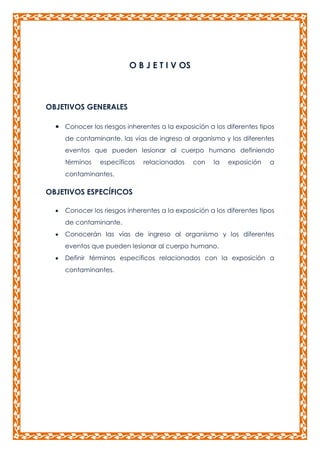 El documento presenta los objetivos generales y específicos de conocer los riesgos de la exposición a contaminantes, las vías de ingreso al organismo, los eventos que pueden lesionar el cuerpo humano, y definir términos relacionados a la exposición de contaminantes. Los objetivos específicos incluyen conocer los riesgos de la exposición a diferentes tipos de contaminantes, las vías de ingreso al organismo, y eventos que pueden lesionar el cuerpo humano.