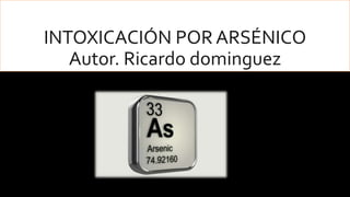 El documento trata sobre la intoxicación por arsénico. Explica que el arsénico se encuentra ampliamente distribuido en la naturaleza y que su toxicidad varía según el compuesto, siendo los inorgánicos más tóxicos. Los humanos pueden verse expuestos a través de alimentos, agua y aire. La exposición prolongada a altas dosis de arsénico inorgánico puede causar cáncer e infertilidad. Los síntomas agudos de intoxicación incluyen vómitos, diarrea e irritación de