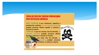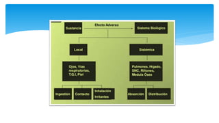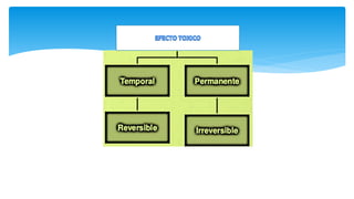 Este documento resume los conceptos básicos de la toxicología, incluyendo que estudia los efectos tóxicos de los xenobióticos en el organismo, tiene dos ramas principales que son la toxicodinamia y la toxicocinética, y clasifica las sustancias tóxicas por su estado físico, estructura química, efectos clínicos y mecanismo de acción. También describe conceptos como dosis-respuesta, dosis-efecto, concentración letal media y dosis letal media.