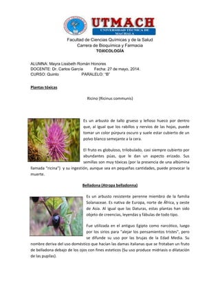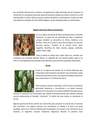 Este documento resume las características y toxicidad de varias plantas y frutas venenosas como el ricino, la belladona, el regaliz americano y la cicuta, así como de animales venenosos como la rana veneno flecha, el pez piedra, la serpiente taipán de interior y la araña de tela en embudo de Sydney. Describe los síntomas y efectos que pueden causar el consumo o contacto con estas especies, incluyendo dolor, náuseas, parálisis, convulsiones y en algunos casos la mu