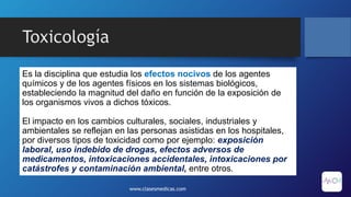 La toxicología estudia los efectos de agentes químicos y físicos en organismos vivos. Los cambios sociales, industriales y ambientales se reflejan en los pacientes hospitalizados por toxicidad ocupacional, uso indebido de drogas, efectos adversos de medicamentos, intoxicaciones accidentales y contaminación ambiental. La toxicología analiza venenos y su dosis para diferenciar remedios de venenos, y cubre áreas clínicas, analíticas, alimentarias, laborales y forenses.