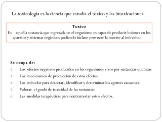 1) La toxicología estudia los efectos de sustancias tóxicas en organismos vivos. 2) Analiza los mecanismos por los cuales las sustancias producen efectos dañinos y los métodos para detectarlas, identificarlas y evaluar su grado de toxicidad. 3) La toxicocinética y toxicodinámica describen cómo el cuerpo absorbe, distribuye, metaboliza y elimina las sustancias tóxicas, y los mecanismos por los cuales interactúan y producen efectos dañinos.