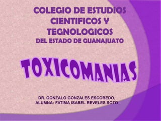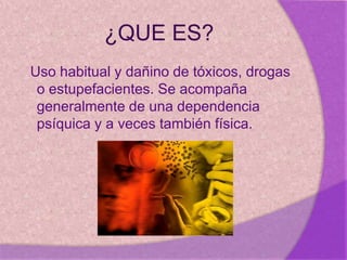 Este documento describe las toxicomanías y las drogas. Define la toxicomanía como el uso habitual y dañino de tóxicos o drogas que generalmente causa dependencia psíquica y física. Explica que el consumo de drogas provoca efectos adversos como malestar general, pérdida de control y memoria. Además, identifica varias drogas comúnmente consumidas como el alcohol, la marihuana, la cocaína, anfetaminas y otras. Finalmente, reconoce que el abuso de sustancias es una enfermedad llamada farmac
