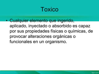 El documento habla sobre los principales síndromes de intoxicación y su tratamiento. Brevemente describe los síndromes anticolinérgico, colinérgico, simpaticomimético y opiáceo, así como las medidas universales de tratamiento que incluyen prevenir la absorción mediante lavado gástrico, favorecer la adsorción con carbón activado y aumentar la eliminación con catárticos. Resalta la importancia de usar antídotos específicos cuando sea necesario y reevaluar continuamente la condición del paciente.