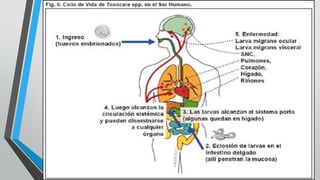 Este documento describe la toxocariasis, una infección causada por los gusanos Toxocara canis y Toxocara cati que afecta principalmente a niños. Los perros y gatos son los hospedadores definitivos y expulsan huevos en sus heces que pueden contaminar el suelo. Los humanos se infectan al ingerir accidentalmente estos huevos. Las larvas migran por el cuerpo causando una reacción inflamatoria. Los síntomas incluyen fiebre, tos, hepatomegalia y eosinofilia. El tratamiento implica