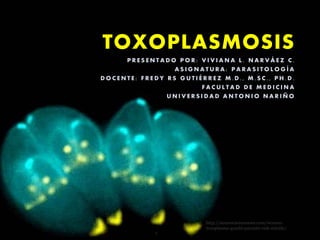 Este documento describe la toxoplasmosis, una zoonosis causada por el parásito Toxoplasma gondii. Explica que T. gondii tiene un ciclo de vida que involucra a gatos como huéspedes definitivos y una amplia variedad de mamíferos como huéspedes intermediarios. La toxoplasmosis puede ser adquirida o congénita, y puede causar una variedad de síntomas que dependen del estado inmunológico del huésped. La infección es común en todo el mundo y generalmente asintomática, pero puede